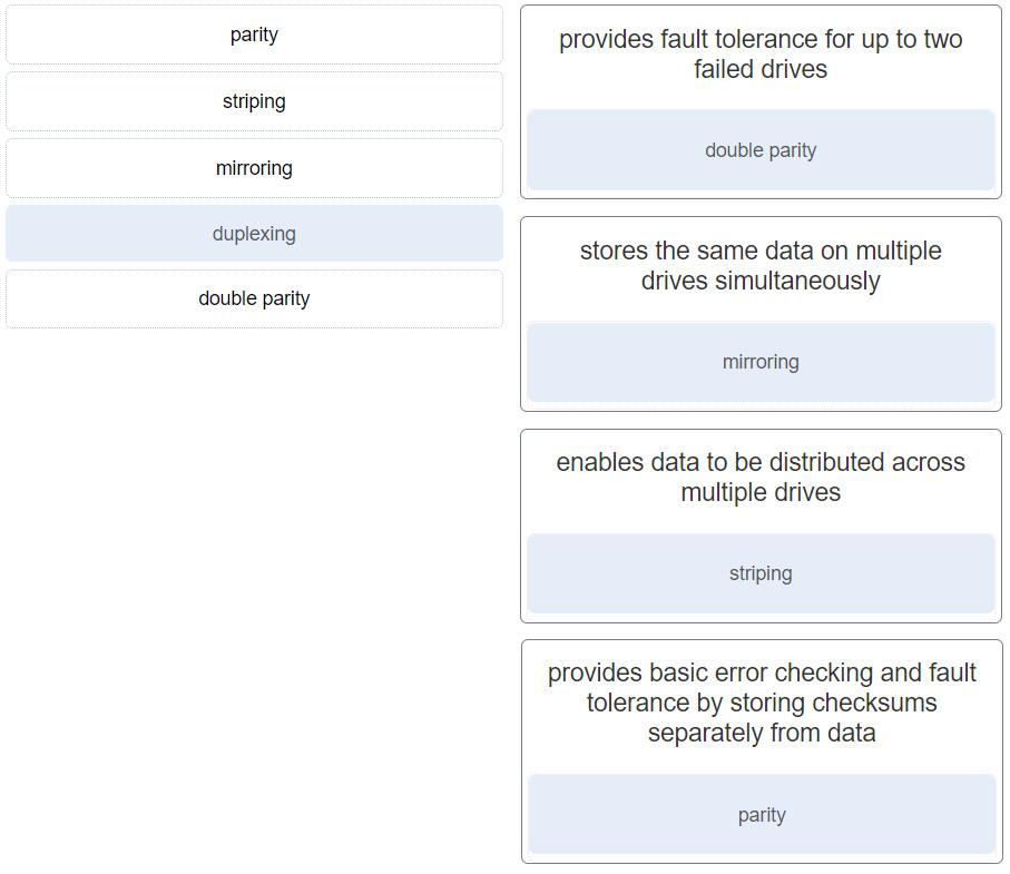 RAID 5 stripes data and parity across a minimum of three drives. It protects against one drive failure while offering good capacity and read speed. RAID 6 requires at least four drives and can withstand two simultaneous drive failures.